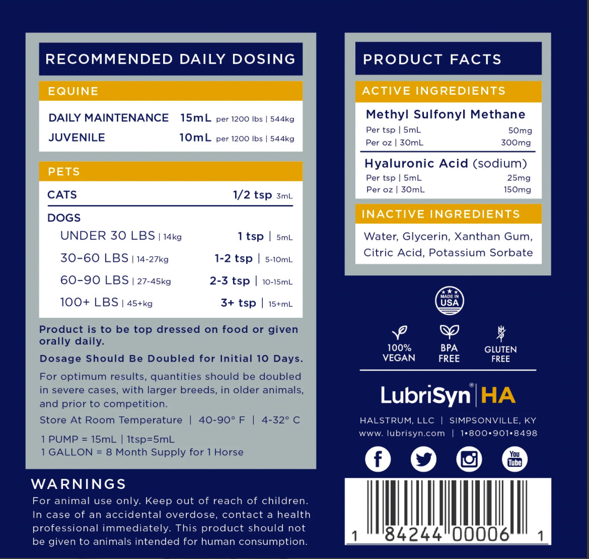 LubriSyn HA is a joint health supplement for horses. It provides 150 mg of sodium hyaluronate and 0.3 grams of MSM per 30 mL serving.